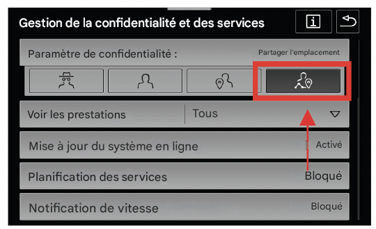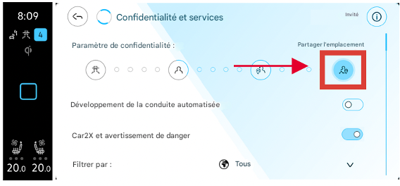 👉 Réglez les paramètres de confidentialité sur « Partager la position du véhicule ».